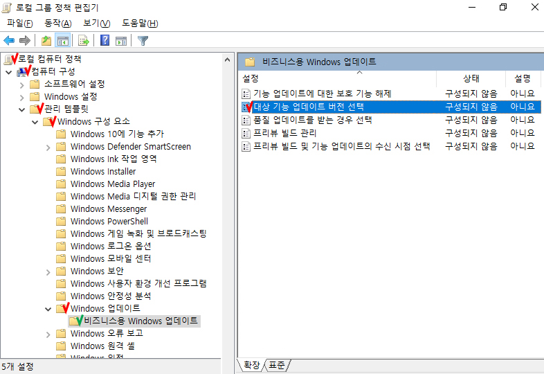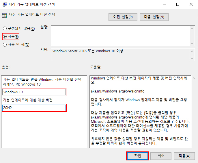 - 대상 기능 업데이트 버전 선택을 열어서 사용에 체크