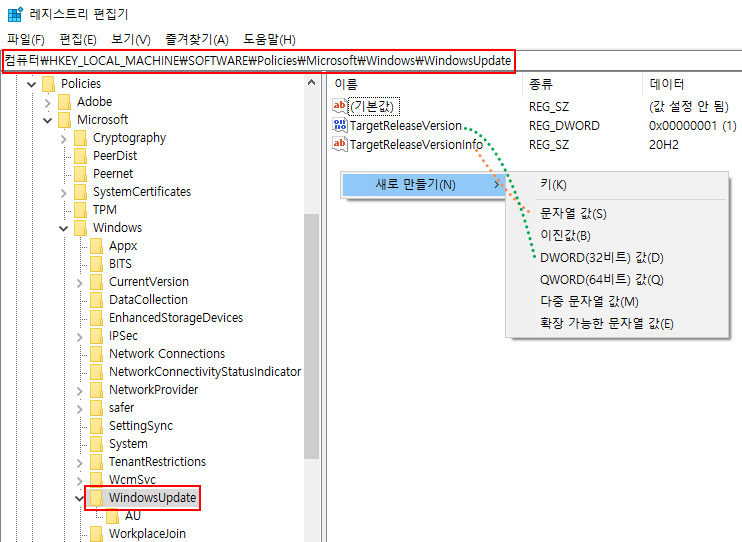 - TargetReleaseVersion이 없으면 우클릭 - 새로만들기 - DWORD(32비트) - TargetReleaseVersion 생성 후 데이터를 1로 변경
